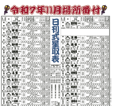 松戸の琴櫻、柏出身の隆の勝、琴勝峰らが大活躍し、目が離せない大相撲。 場所中の勝敗を毎日記録できる日刊式星取表(日刊スポーツ発行)が好評だ。顔写真付きのプロフィールにはお給金やニックネーム、家族構成までが記されていて、15日間楽しめる一枚だ。 新年1月11日、両国国技館で始まる初場所用星取表を5名様に。