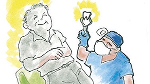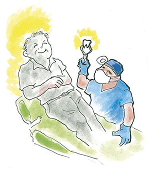 アメダ先生の怖い顔に、男の人は目をぎゅっと閉じて、口をむすびました。アメダ先生はこんどはやさしく、「佐々木さん、佐々木さん。まかせてくださいよ」と肩をたたきました。あきらめた男の人は口を開けたので、さっと注射をしました。「はい、そのまま」すかさずペンチのような道具で、ぐいっと親知らずを抜きました。