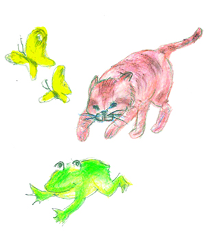 (あーっ、かえるだ、ちょうちょだ)見るものがみな珍しい。ちょうちょを追いかけていたら、次はいじめっ子の猫に追いかけられました。