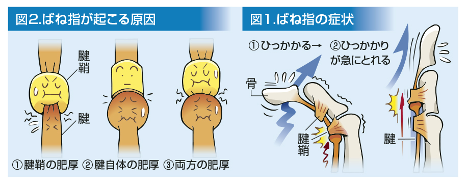 ばね指とは、指を曲げる腱(屈筋腱)や腱鞘の炎症(腱鞘炎)のことです。指は腱によって曲げたり伸ばしたりできます。その腱の浮き上がりを押さえたり、腱の少ないスライドで指を大きく動かす、などの役割を果たしているのが腱鞘です。腱鞘は手の平から指にかけていくつかあり、ここで炎症が起こります(図1)。ばね指(腱鞘炎)の原因としては、①腱鞘の肥大②腱自体の肥厚③その両方があります(図2)。