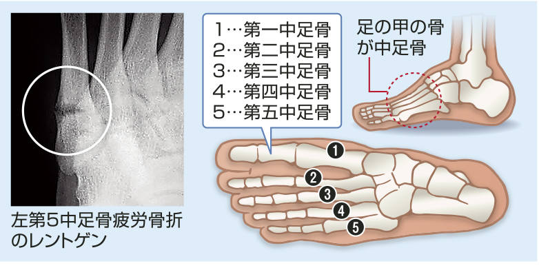 A.足の甲の痛みであれば、中足骨の疲労骨折が考えられます。中足骨の疲労骨折は大きく2つに分けられます。第二、第三、第四中足骨の疲労骨折と、第五中足骨の疲労骨折です。第二~第四中足骨の疲労骨折は、陸上の長距離選手によく見られます。着地や蹴りだし時などに、外力が繰り返し加わることによって起こります。