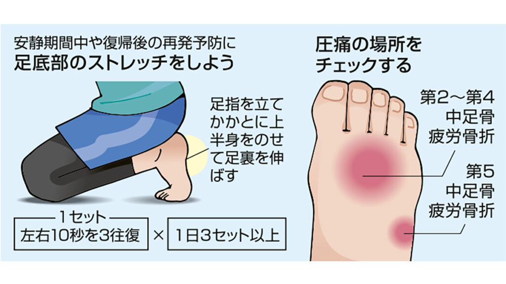A. 足の甲に痛みを感じたときは、アイシングの後、湿布をして安静に。圧痛がなくならず、歩いても痛いようならすぐに整形外科を受診してください。第二~第四中足骨疲労骨折と第五中足骨疲労骨折では圧通の箇所が違うので自分でも両方のチェックをしてみてください(イラスト参考)。