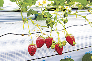 早春のお楽しみは3月スタートのいちご狩り。酸味も楽しめる「スターナイト」や、甘い甘い「やよい姫」のほか、「恋みのり」「かおりの」の品種がハウス内いっぱいに食べ頃を迎える。