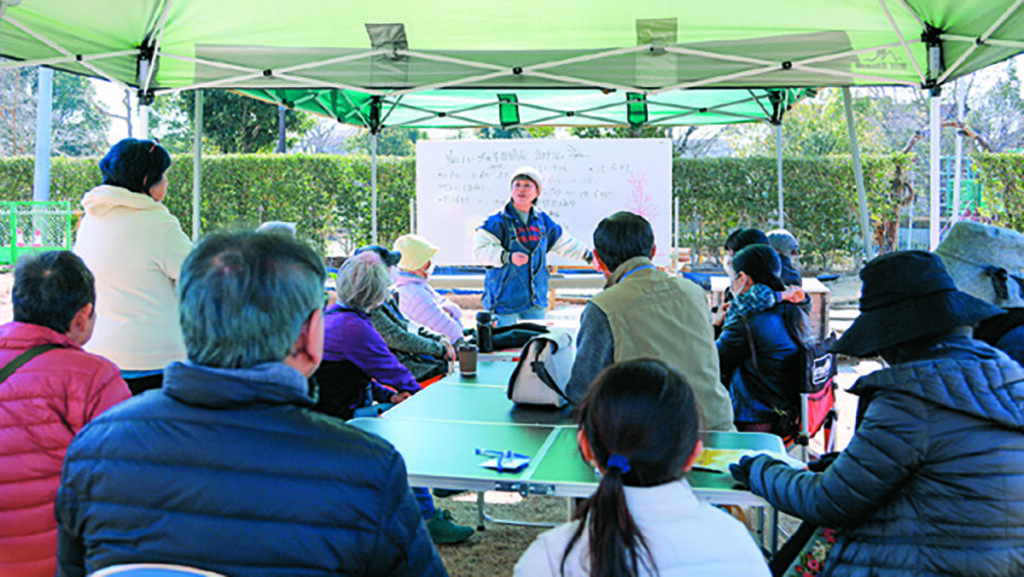 BASEは、小さな広場だが、芝生の一角に菜園があり、ハーブのほか、昨年はクラフトビール作りを目的に、トマトや大根、赤かぶなども栽培した。 今回のイベントでは、菜園の年間計画づくりも行われた。集まった人たちが「何を作ろうか」と談笑しながら、スケジュールを決めていった。野菜は、夏にしょうが、トマト、さつまいも、秋冬にはブロッコリー。ハーブ園には、ローズマリーやレモングラス……。秋には芋ほり体験もしよう、と計画に盛り込んだ。参加者の関心は高く、菜園のアドバイザースタッフに、選定の仕方や害虫駆除の方法など、次々と質問していた。
