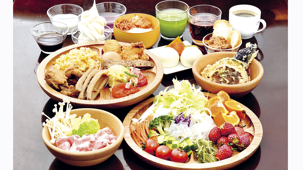 直売所の新鮮な食材を活かしたビュッフェ形式の料理が提供され、季節の野菜を中心としたメニューがずらり。