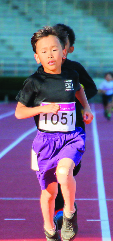 小学1年男子600㍍で優勝したのは、柏市の小林颯時さん。記録は2分22秒25。ふだんは野球やラグビーをしている小林さんは、幼稚園でも小学校でもかけっこで負けたことがない。600㍍は初めてで「長かったけど、最後に追い越されず、気持ちよかった」と満足そう。
