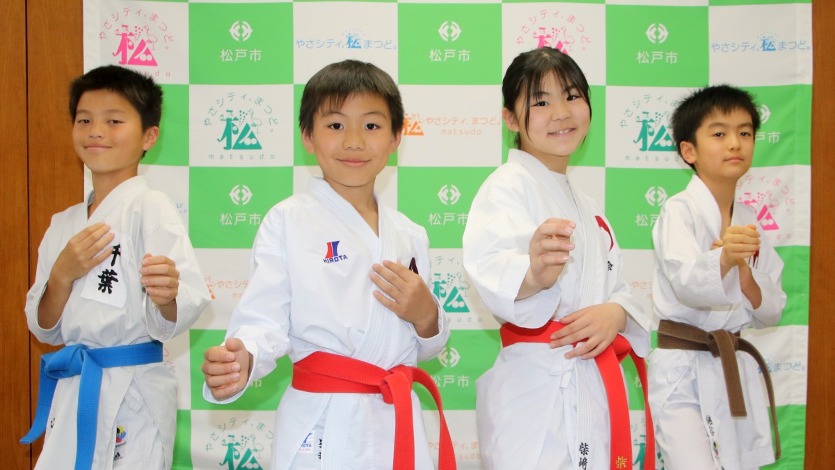松戸市で空手に取り組む子どもたちが、全国や県内の大会で活躍している。昨年の全日本少年少女空手道選手権で3位になった選手ら4人が、4月24日、市役所を訪れ、松戸隆政市長にこれからの活躍を誓った。