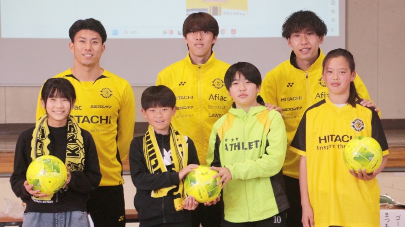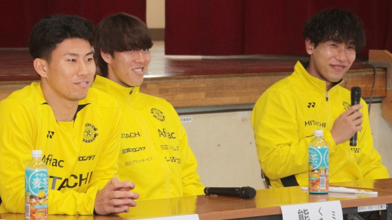 子どもたちからも質問が次々と。「今までのサッカー経験の中で大変だったことは?」との問いに細谷選手は「点が入らない時期が大変だった。3~4カ月、続いたかな。(乗り越えるために)シュートを打ち続けた」。また「体づくりはどうやっていますか。僕は肩幅をもっと広げたい」という児童に松本選手は「今は、いっぱい食べて、いっぱい寝ること。それと、歩く時に胸を張って歩けば肩幅が大きく見える。卒業式も胸を張って歩くといいかな」と笑顔でアドバイスした。