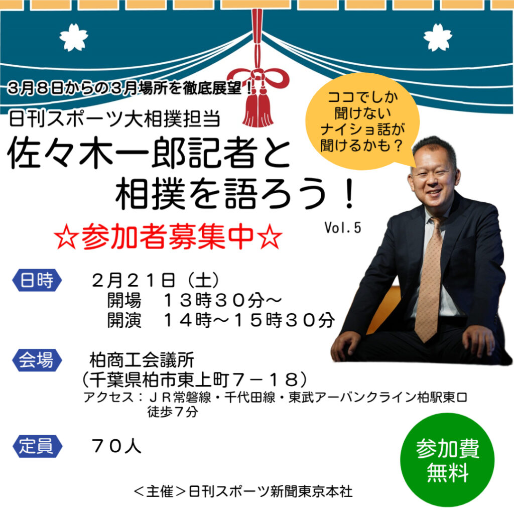日刊スポーツでは2026年2月21日(土)に「佐々木一郎記者と相撲を語ろう」と題した講演会を開催します。相撲に興味のある70人を無料でご招待します(申込者多数の...