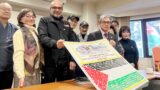 式典に参加した同市在住の本田満さん(66)は「今年で3度目。孫を連れての約束ごとになってきました。この鐘をついた経験が心のひっかかりになれば」と話し、5人の孫には鐘をつく前に「平和のことを願ってね」と話したと言う。