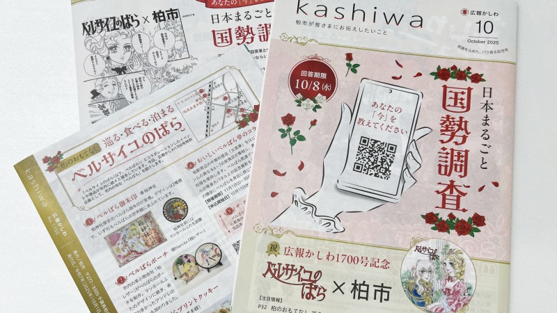 柏市の広報誌「広報かしわ」10月号が、「ベルサイユのばら」の世界観に覆われた。巻末で、市内で扱われているベルばらコラボグッズを紹介するだけでなく、巻頭特集の「国勢調査」の紹介でも、随所にバラの花が咲き誇る。創刊1700号の節目にと「感謝を込めた、バラ香る記念号」になっている。