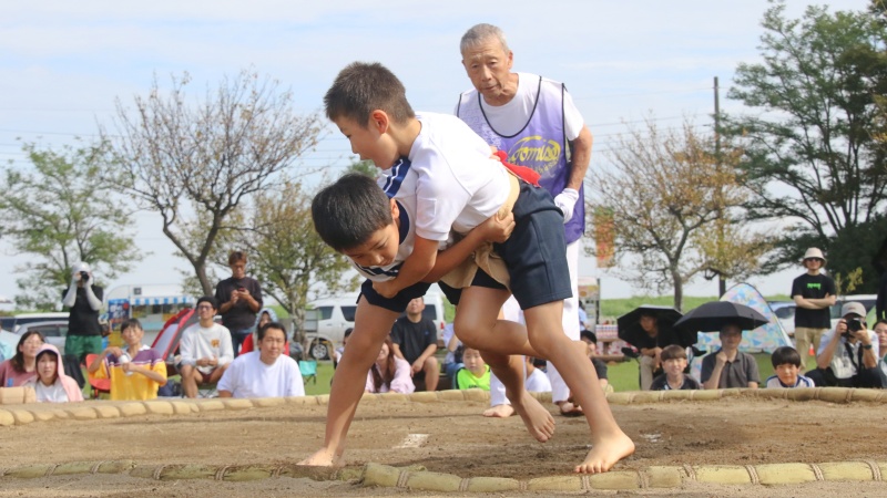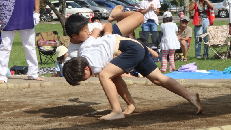 毎年秋の恒例行事で、会場のあけぼの山農業公園には、四本柱が立つ本格的な特設土俵がつくられ、近隣町会ののぼりもたなびいた。