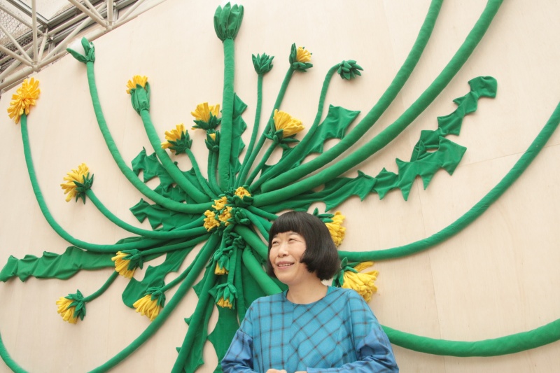 JR柏駅東口近くの柏モディ前が、一晩でタンポポ畑に生まれ変わった。屋根を支える2本の柱には黄色の花が勢いよく咲く。タリーズの2階テラス席では、高さ3・6㍍、幅5・4㍍の巨大タンポポが、今にも綿毛を放とうとしている。 「アートラインかしわ」のメイン展示の一つ、アーティスト川上和歌子さんの作品「Blooming―毎日のように新しい花が咲く―」だ。設営は、川上さんとアートラインスタッフらが徹夜で取り組んだ。7年前にもアートラインで作品展示をしたことがある川上さんは「柏では、ボランティアの方たちが、『柏が好き』『芸術が好き』という熱い思いでサポートしてくれる。独特なオーラがある」と感じている。