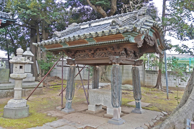 金宝殿本社の参道にある「手水舎」も同年築で、四隅の柱に龍が彫られ、手水鉢の真上の天井部分には雷神の高浮彫がある。いずれも、彫刻は野田の宮大工が彫ったものという。