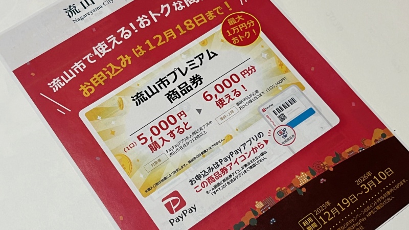 商品券は1口5000円で、流山市在住で12歳以上の市民が購入でき、1人の購入額上限は10口5万円。最大で1万円お得になる。10万口の販売を予定し、申し込み期間は12月1~18日。応募が予定口数を超えた場合は抽選となる。利用期間は12月19日~3月10日の3カ月間。