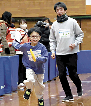 小学1年の山下ひかりさんは「走るのが大好き。楽しい」と、一緒に参加した父親にバトンを渡した。小学2年の奥木美湖さんは 「早く走れるようになりたい」と参加。この日にむけて走り方のコツを教えてもらい「緊張したけど、上手に走れた」と笑顔だった。