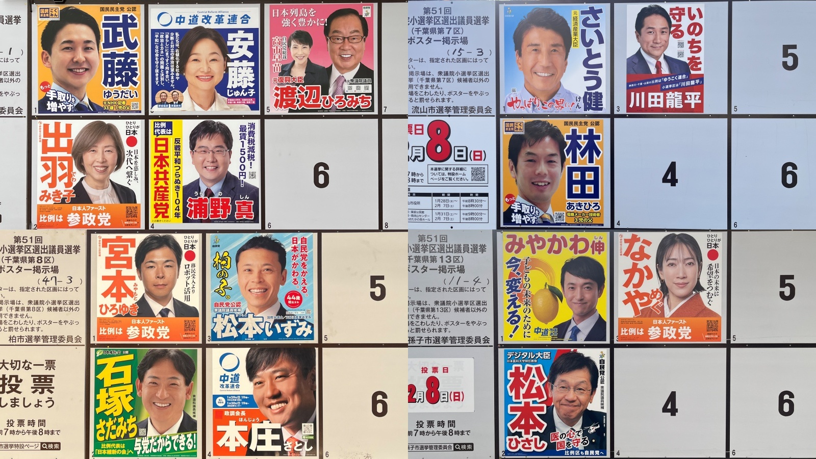 第51回衆議院選挙が27日、公示された。東葛地域が選挙区となる千葉6、7、8、13区には計15人が立候補した。このうち8区は、連立を組む自民と維新がそれぞれ候補を擁立した。各選挙区の候補と選挙ポスターは下記の通り。ポスターには、候補の笑顔や引き締まった顔、さらに党首の写真にキャッチコピー、訴えなどが盛り込まれ、それぞれの特色が現れている。