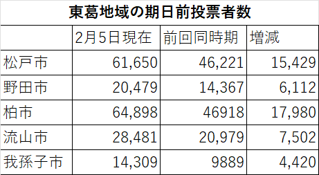2月8日の衆院選投開票日が迫るなか、東葛地域の期日前投票者数は、5日現在で前回を3~4割、上回っている。投開票日は関東地方の平野部でも雪の予報があり、「荒天を避けて期日前投票をしているのでは」との見方もあり、期日前投票者の伸びが投票率にどう影響するのか、注目される。