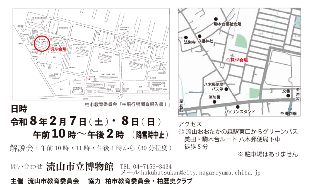 8日の見学会は午前10時から午後2時までで、解説会を午前10時、11時、午後1時に開く。無料で、事前申し込みは不要。駐車場はないので、公共交通機関の利用を呼び掛けている。近くの八木郵便局バス停から徒歩約5分。問い合わせは同博物館(04・7159・3434)へ。