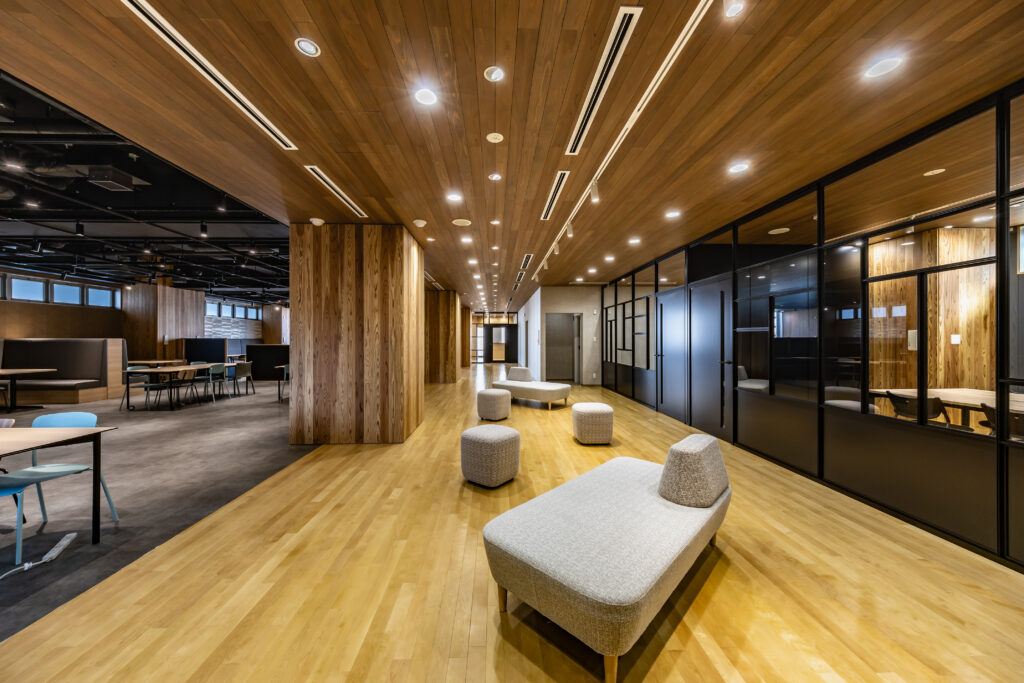 同ビルは鉄筋コンクリート造りながらも、内装やデザインに「木」のぬくもりを感じる「木質化」のコンセプトによる心地よい空間で、2階・来客用フロアと6階・大ホールには、天然木を採用。さらに大ホールは、最大250人が収容可能で、社内の大規模会議や研修だけでなく、多目的な活用を目指すという。