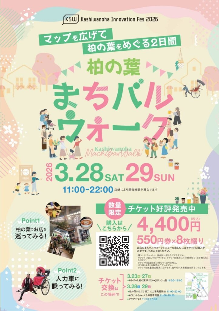 まちバルは、28、29日に開かれる「柏の葉イノベーションフェス2026」のイベントの一つ。フェスではこのほか、バラエティ豊かなパンが勢ぞろいする「パン祭り」、体験型イルミネーション「YAKEIちゃん」なども催され、柏の葉の街全体が賑わう。