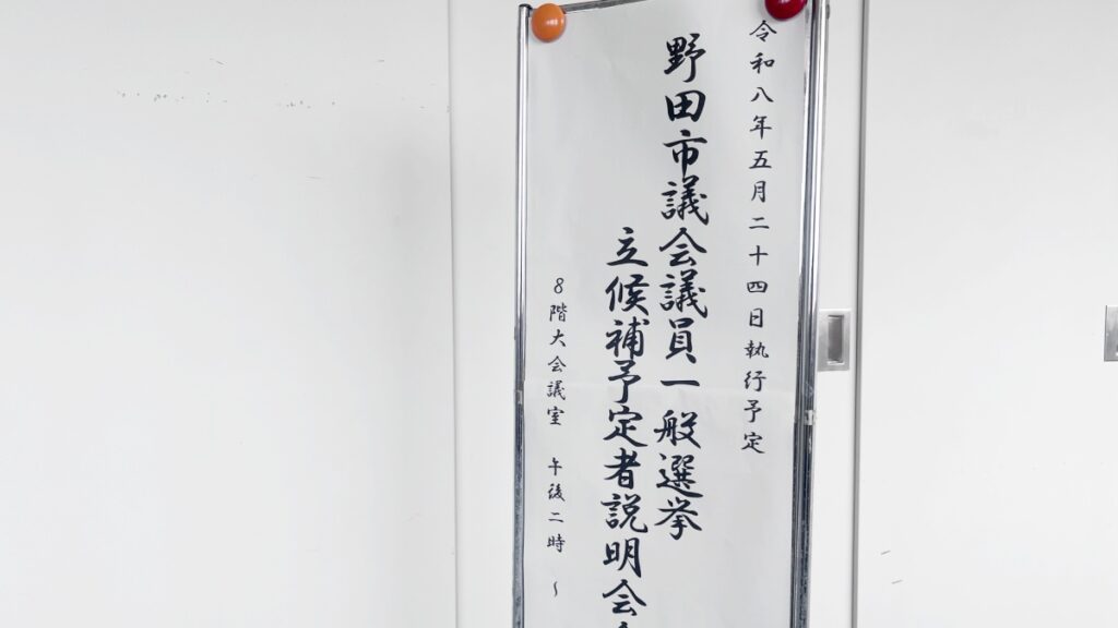 出席したのは、現職20陣営、新顔11陣営、元職2陣営、非公表1陣営。残り1陣営は、説明会終了後、市選管が一度交付した書類を返却、辞退した。