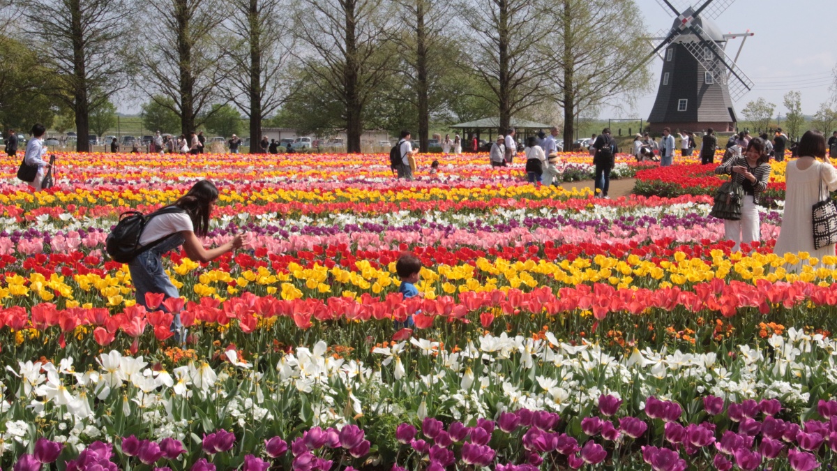 同園の風車前のお花畑には、赤や黄色、紫など6色のチューリップが16万球植えられ、鮮やかな色が折り重なるように広がっている。