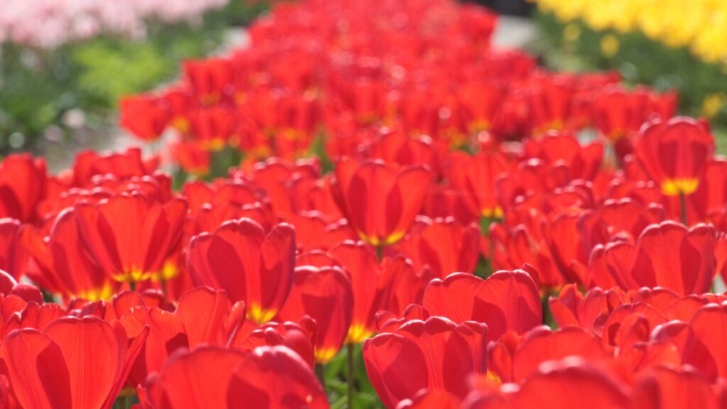 同園によると、チューリップは白やピンクなど一部散り始めている色もあるが、遅咲きの赤や黄色などはしばらくの間、楽しめそうだという。